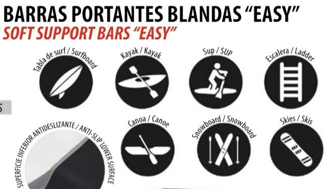 Barras portaequipajes blandas. Material compuesto de espuma Oxford 600D con superficie PVC antideslizante. Ideal para transportes esporádicos de tabla de surf o snow, kayak, canoas, skies, escaleras... Medida 118x13,5x7cm Peso máximo de 75kg
