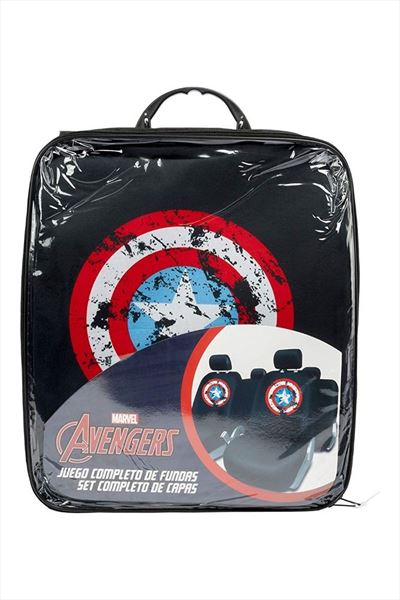 Juego de fundas de asiento Capitán América. Fundas completas de asiento con el icono del gran Capitán América. Fundas de color negro. Modelo universal adaptable a la mayoría de vehículos. El capitán de Los Vengadores se pone al volante.
