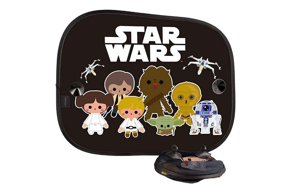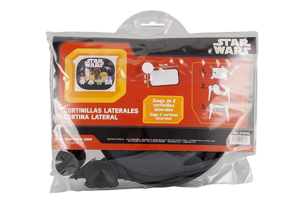 Juego de parasoles laterales para coche. Colección Saga Star Wars Medida universal 44x38cm Fijación con 2 ventosas en cada cortinilla. Colocación directa sobre el cristal lateral del coche.