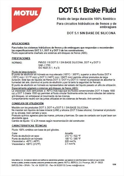 Líquido de Frenos 100% Sintético de larga duración. Uso en todos los circuitos hidráulico de frenos y embragues, según las recomendaciones de los fabricantes DOT 5.1, DOT4 y DOT3. Especial para frenos con ABS. Uso en turismos, industriales y moto. .
