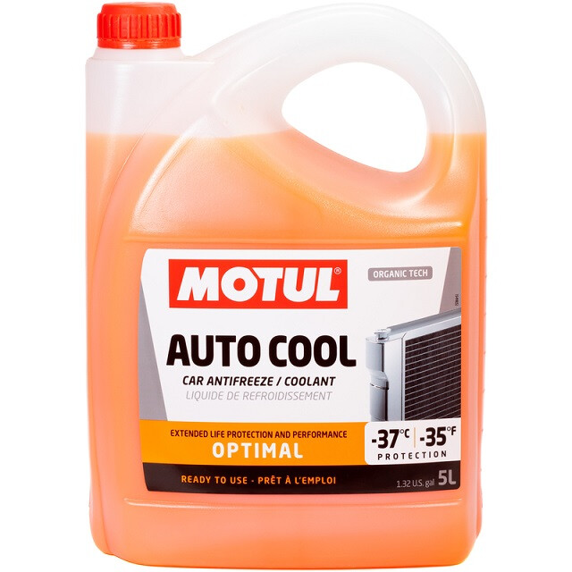 Anticongelante Motul Auto Cool Optimal Organic Tech con inhibidores de ácido orgánico (OAT) Máxima protección -37ºC Niveles G12+ 774D/F para VW, MB, Renault, Jaguar... Formato en 5 litros. Color NARANJA. Uso directo