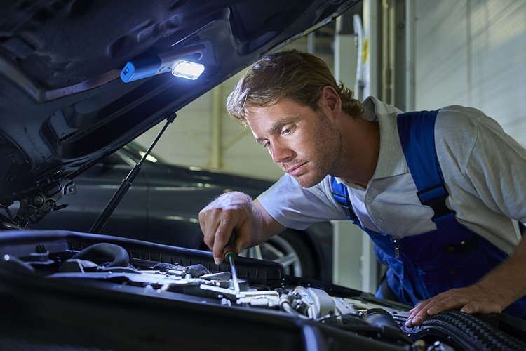 Professional Mechanic Repairing Car. Professional car mechanics checking under hood in auto repair service. Automechaniker // Mechanic checks a vehicle