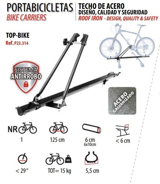 Portabicicletas Top-Bike en acero galvanizado. Instalación sobre barras portaequipajes del vehículo. Transporte de 1 bicicleta, con llanta <29" y peso máximo 15kg ø6cm cuadro y ancho de rueda <5,5cm Incluye sistema antirrobo