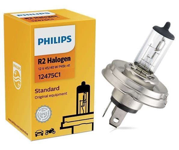 Lámpara para faros principales R2 Philips Halógena 45/40W 12V Conector P45t-41. Máxima visión en carretera para maximizar la claridad. Mayor duración y vida útil para aumentar la visibilidad. Conduce de forma segura. Original Philips